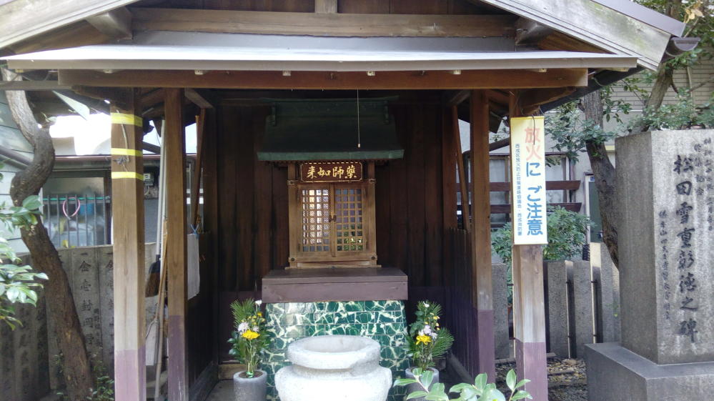 松乃木大明神内には薬師如来なる祠もあり、その右側の柱には「放火にご注意」という文字が。なぜに放火に注意?・・・って思うかもしれませんが、この地域一帯は昔ながらの木造住宅が密集しているのです。