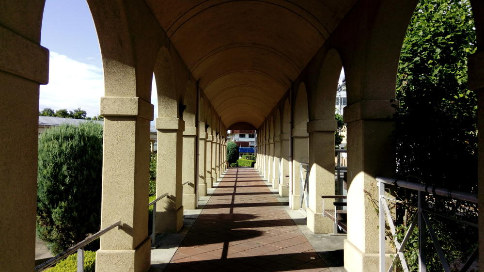 薔薇回廊というだけあって、バラ園の両サイドには屋根付きの廊下が幾つかあります。ベンチも備え付けられていて、優雅なひとときを過ごすにはうってつけ・・・・・・だと思いたい。(※車の騒音は相変わらずです)