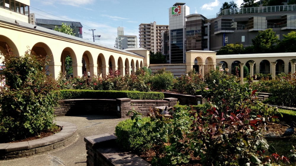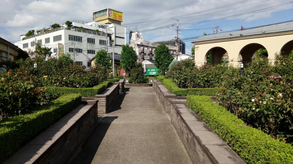 バラ園を見渡してみますと、ほとんどの種類が咲いてませんでした。どうやら僕のオーラ(ぼっち特有の佇まい)にバラが委縮してしまったようです。おかげで後ろのスーパー玉出の看板のほうが派手になってしまいました。(※バラがほとんど咲いてないのは訪問した時期が悪かっただけだと思う。7月上旬)