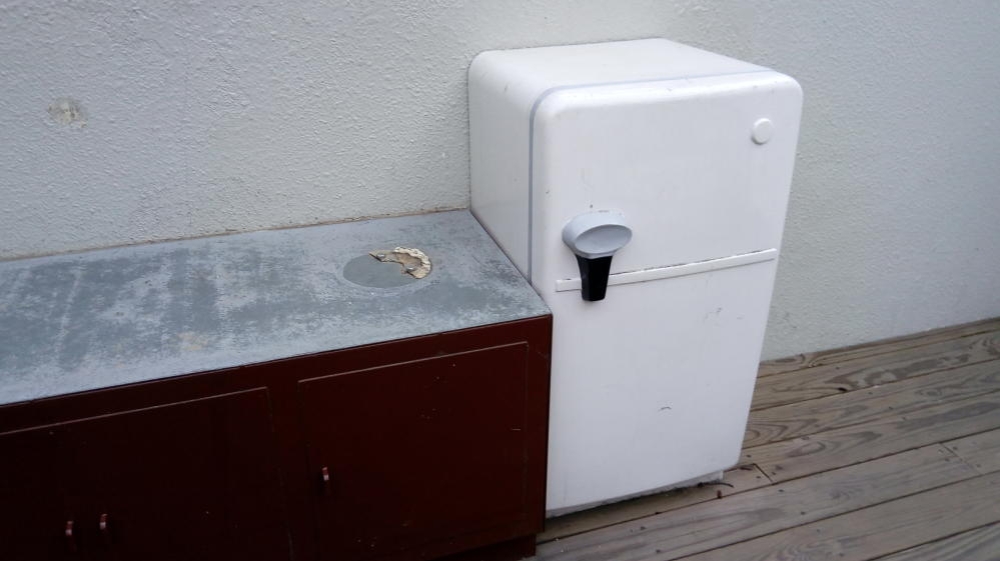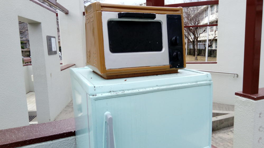 やや小さめの冷蔵庫の上にはトースターっていう現代まで受け継がれている謎文化。もちろんどちらも作り物なので使用不可。