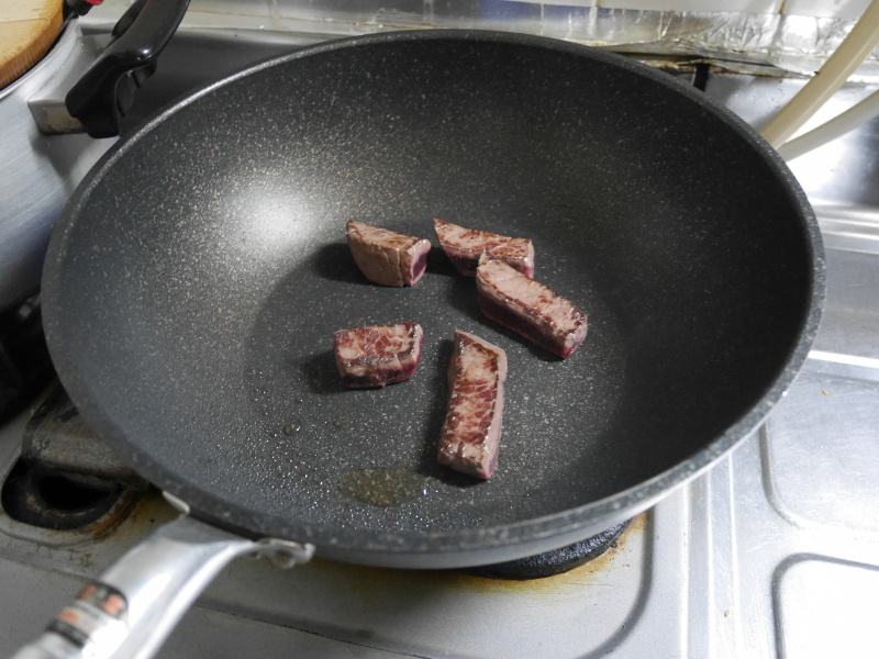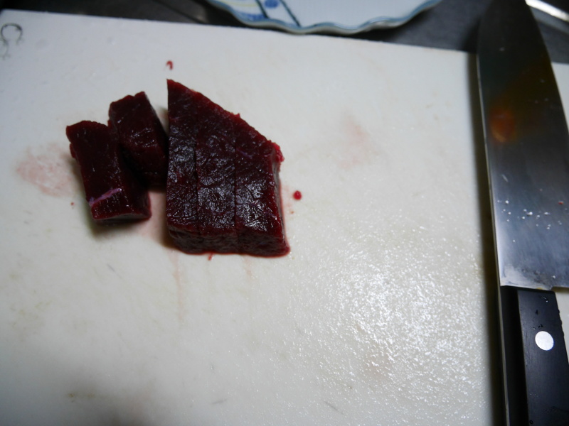 まずはこのように食べやすい大きさに切り分けます。 肉がめちゃめちゃ分厚いのでこれくらいが火が通りやすくていいだろう。 もともと刺身用ということで、生肉の味を活かしたい。 なので焼き具合はレアくらいにしました。
