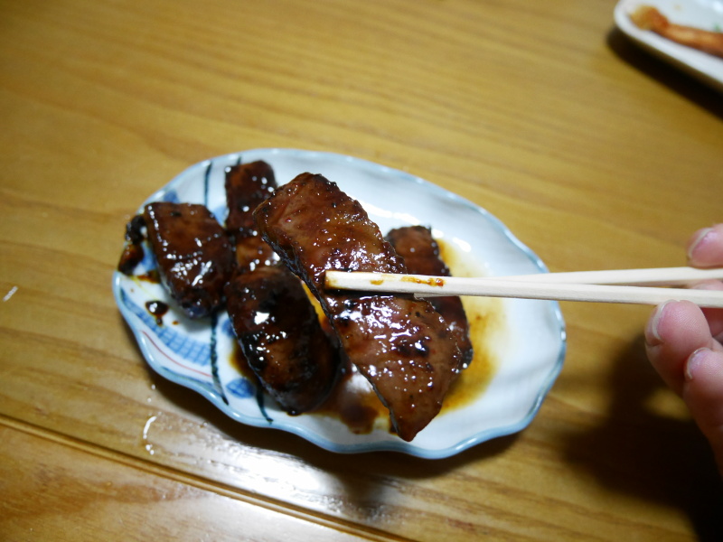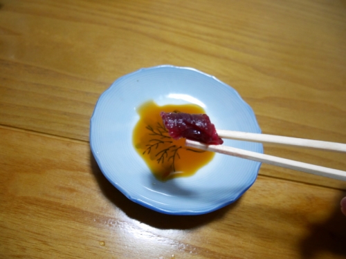 見た目は完全に肉ですね。 クジラって海に住んでるから魚っていうイメージがあるのですが、どっからどうみても肉ですね。 醤油にひたして食べます。