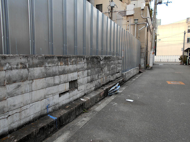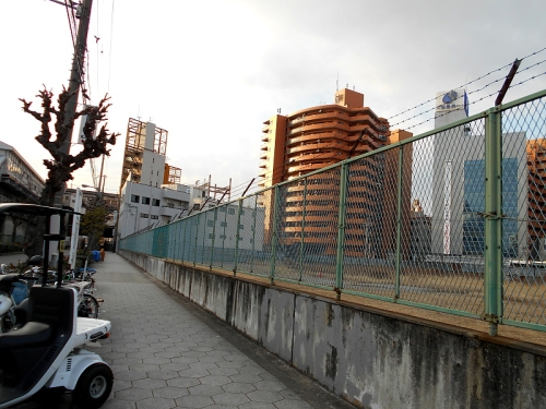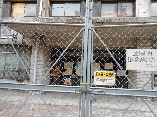 全体的にこのようなバリケードや有刺鉄線付きのフェンスなどで隔離されてます。 たぶんいまでも不法侵入する人たちがいるのでしょうね。 さすが治安最悪の街、大阪市です。泣けてくるぜ