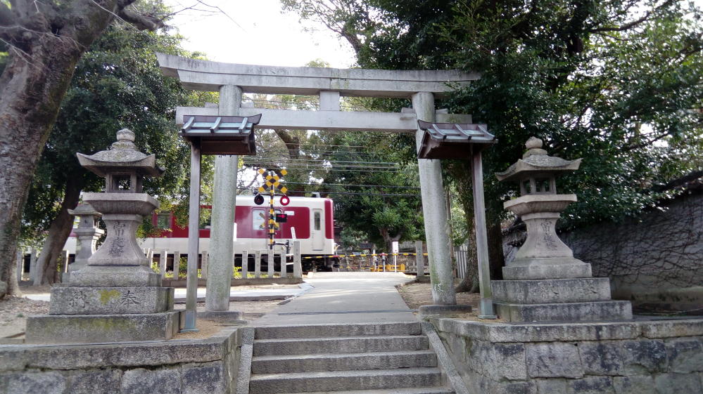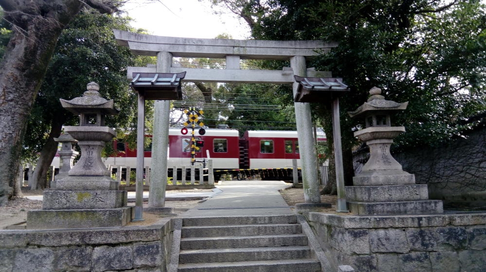 ここには澤田八幡神社(さわだはちまんじんじゃ)っていう神社があるのですが、境内に踏切がある珍しい神社なのですよ。もちろん今でも鉄道(近鉄南大阪線)は運行しているので、神社の境内を横切るように電車が通る光景を拝むことができます。