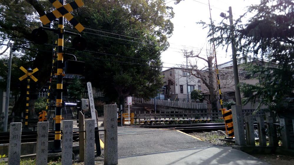 これが澤田八幡神社の境内を横切る線路。やはり神社ということで、フェンスの代わりに玉垣(たまがき:石の柱に名前書いてるやつ)になっている。他は特に通常の踏切と変わらないご様子。