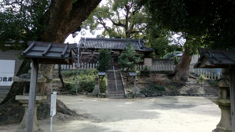 踏切の先はこのような開けた場所。奥には石階段があり、拝殿らしき建物もある。