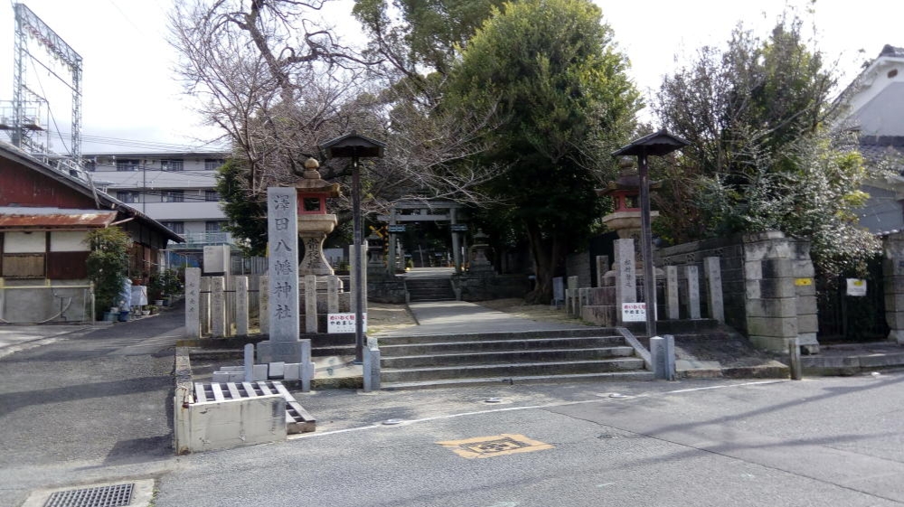 この澤田八幡神社は藤井寺駅と土師ノ里駅(はじのさと)の間に挟まれている。最寄駅は土師ノ里駅で、東へ約300mくらいに土師ノ里駅はあるぞ。