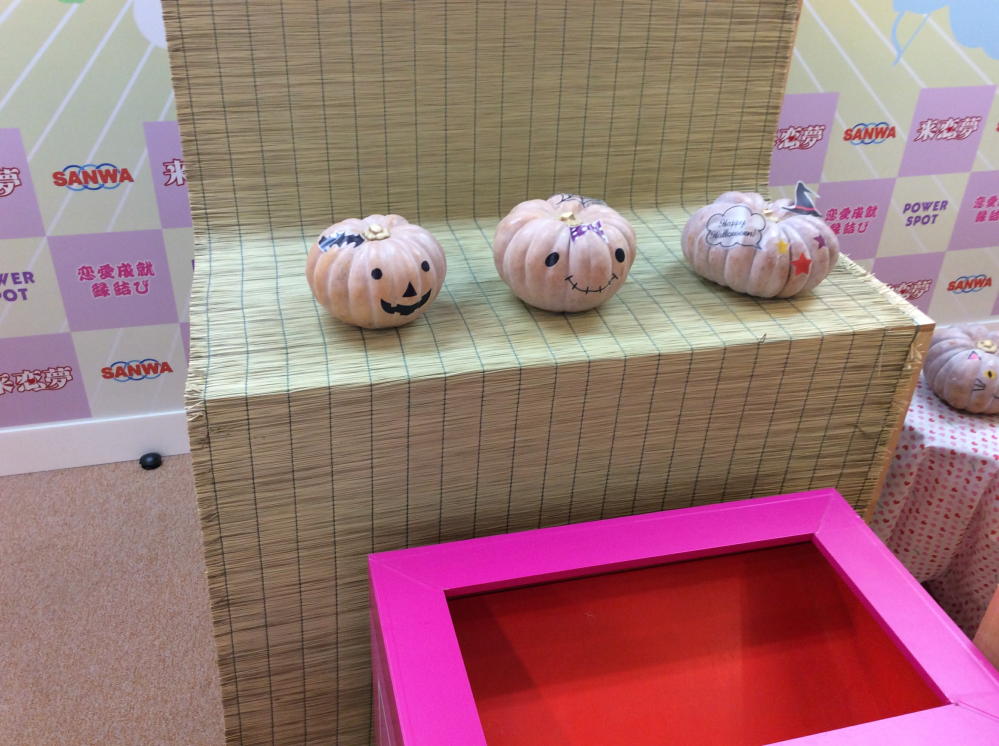 そんなハロウィンにちなんでか、商店街内にあるピンクでファンシーな『来恋夢神社(くるむじんじゃ)』にもハロウィンのオバケかぼちゃが鎮座していました。しかも美人で可愛らしい顔のね。