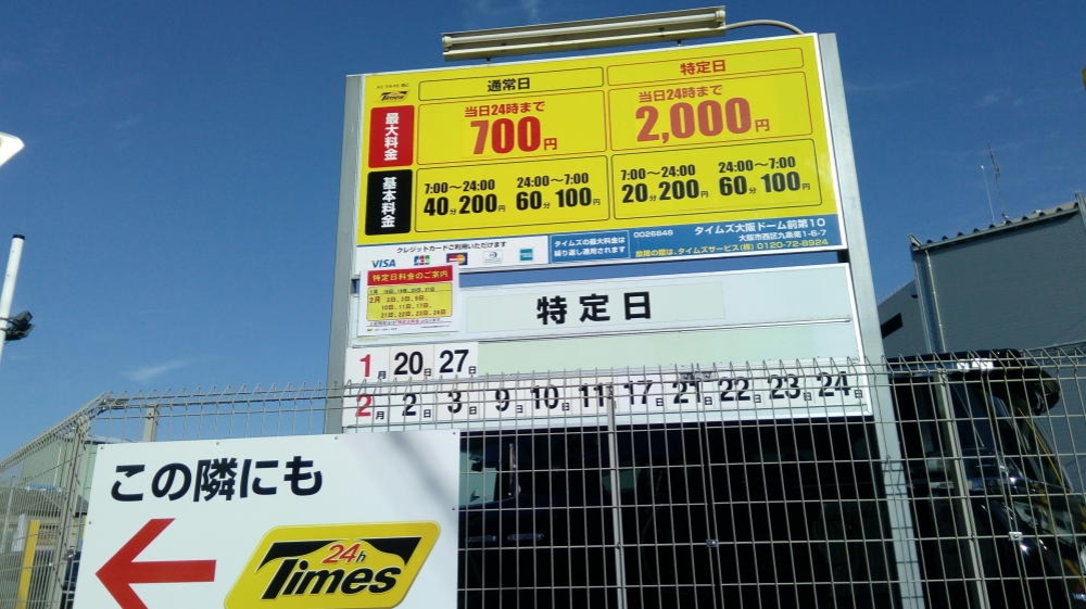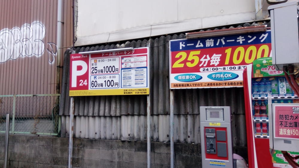 ちなみにですが、京セラドーム周辺のパーキングには通常日料金(普通の値段)ってのとは別に特定日料金(通常日より値段が高い)ってのがあるので、わりとそのへんも注意したほうがいいです。しかし、どうやらSystem Parkドーム前パーキングは通常日・特定日ってのが無くて、いつもこのお値段っぽい。看板には何も書いてないもんね。
