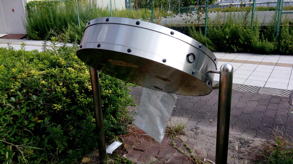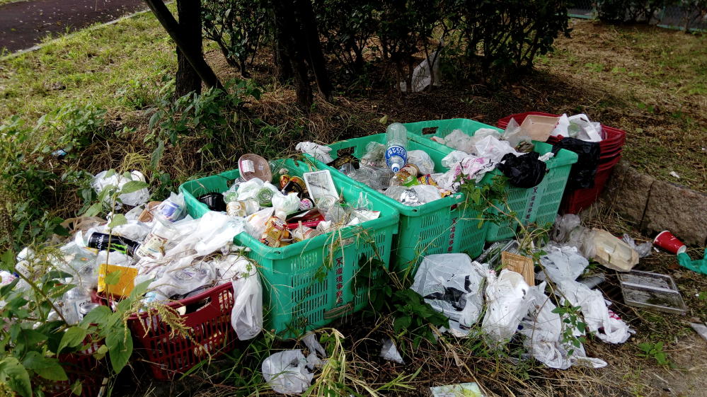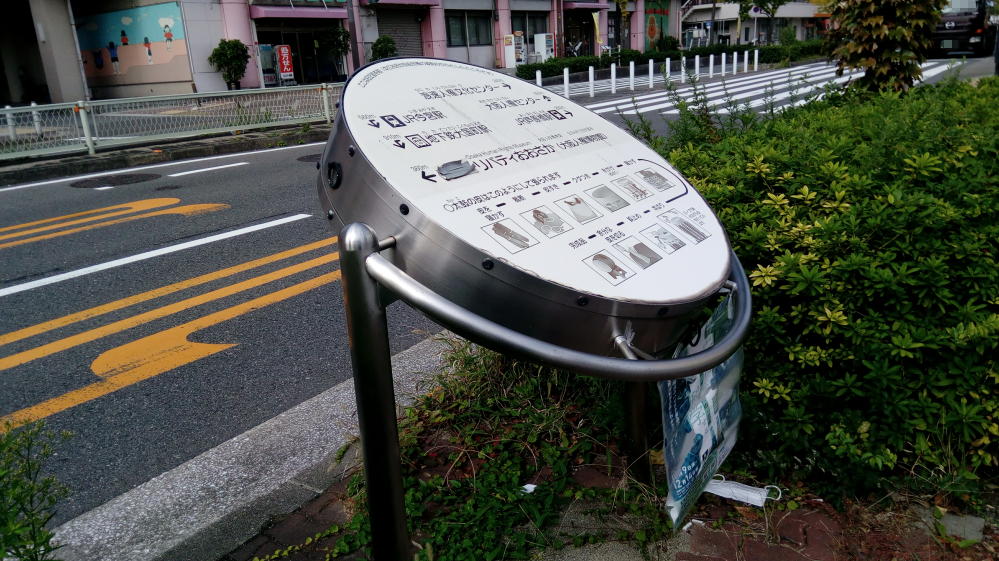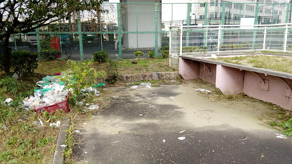 ゴミ捨て場と化している一角があった。大阪市の環境事業局の緑のカゴなので、もしかしたら市が設置したのかもしれん。知らんけど。