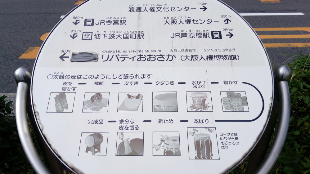 そして新なにわ筋と呼ばれる大通りに出た。この近辺では、芦原橋の名物の和太鼓をモチーフにしたモノや、和太鼓に関係するモノが設置されている。