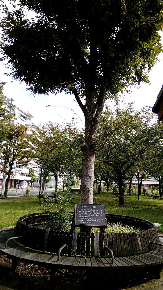このベンチの中央にある木は「ケヤキ」といって、和太鼓の胴(本体の木の部分)になるらしいぞ。胴として使うには100年以上育て、太く大きくならないと使えないのだ。おそらく太く成長した幹を、そのままくり抜いて、太鼓の胴に加工するんだと思う。