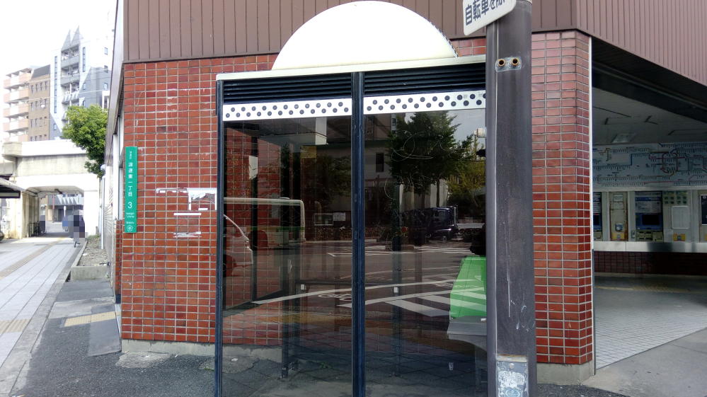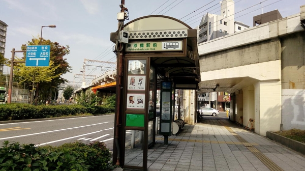 芦原橋駅前のバス停。よくみると、バス停の屋根も太鼓型やな。