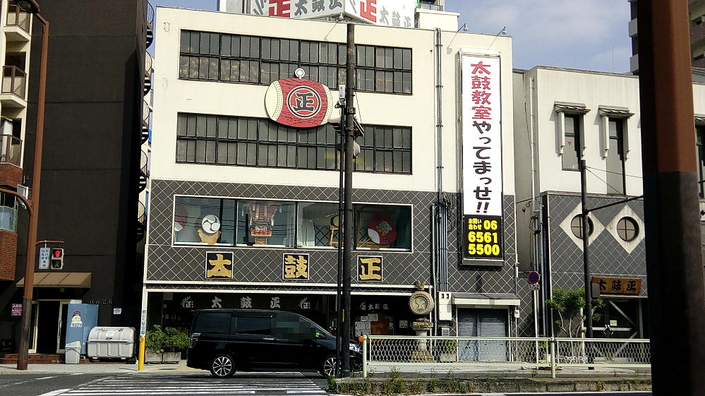 そして道路を挟んで、駅の向かい側にあるのが「太鼓正」という。ここはテレビでよく紹介されてる有名なお店です。太鼓教室もやっているらしく、小さな和太鼓とかも売っていたぞ。