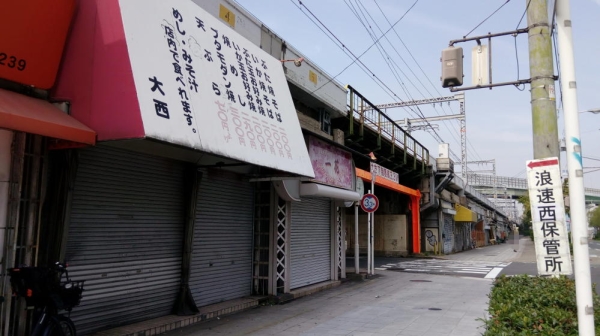 高架下には閉業した飲食店などがズラリと並んでいる。上の写真には写ってないが、唯一、小さなタコ焼き屋さんが今でも営業していたぞ。ここらへんのお店は、環状線が完成した当初に出店したのだろうか、ほとんどが古そうなお店だった。