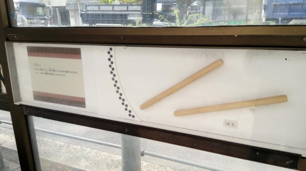 「ばち」が展示されてる。太鼓の達人っていうゲームが流行ってた頃は「マイばち」を持参してゲーセンに行く青年とかが結構いた記憶がある。今でも太鼓の達人ってあるのかな。