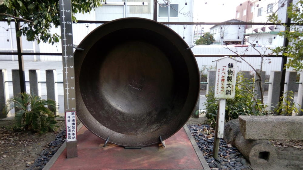 そんな河内鋳物師の中には初めて鋳造で鍋を造ることに成功した人たちもいて、廣國神社では鍋宮大明神として祀られてる。そして廣國神社には鋳物製大鍋がある。