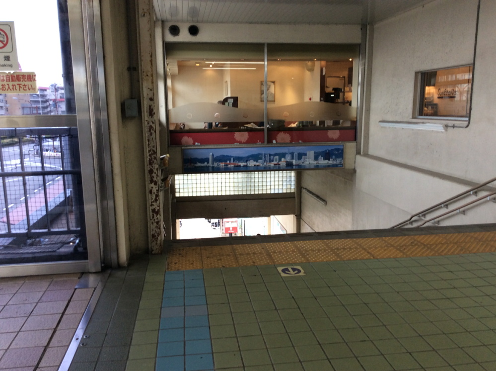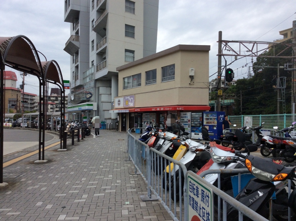 自販機が設置されている場所は超簡単。舞子駅の西側の出入口の階段を降ります。するとバイク置き場と小さな商店が見えてきます。
