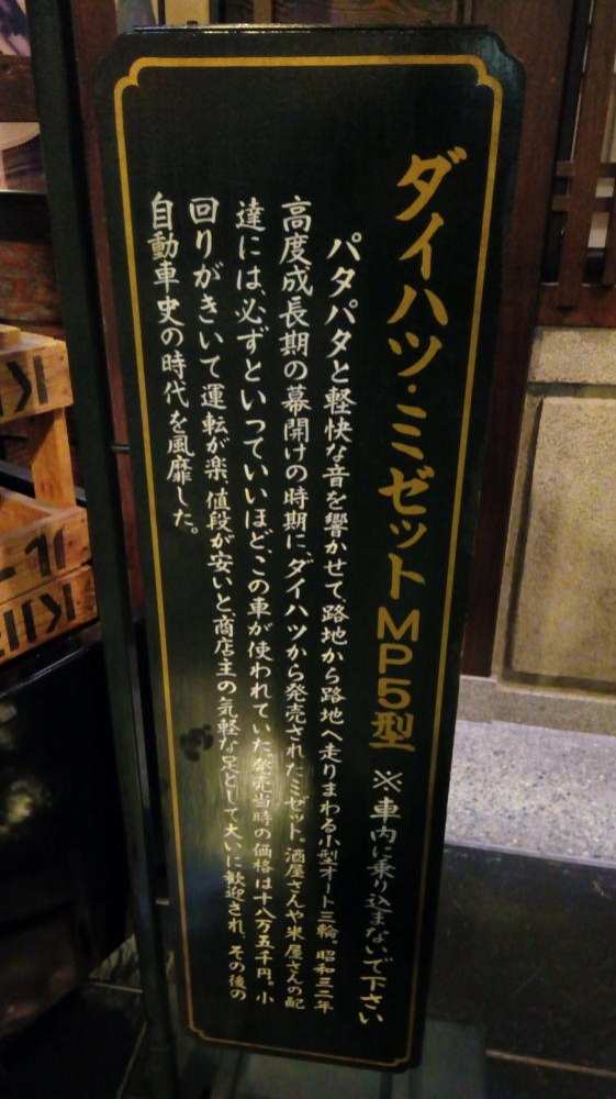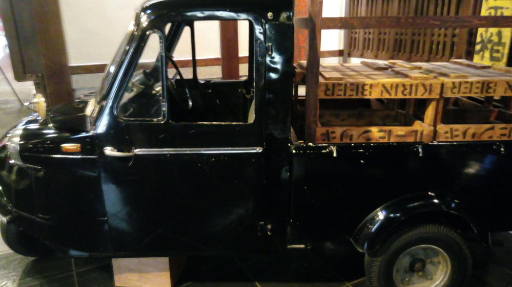 滝見小路の廊下を歩いていると三輪の自動車が展示されていた。これはダイハツのミゼット・・・現在でもたまにこういうの走ってるよね。この時代の軽自動車は360ccだったっけ?・・・車のことはよくわからん。
