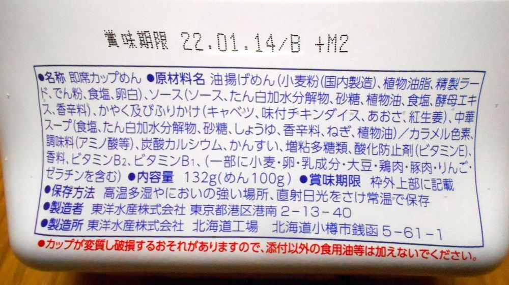 やきそば弁当ですが東洋水産が製造者となっています。パッケージに「北海道工場からお届けします」って書いてあった通り、北海道小樽市の工場で製造されているようです。