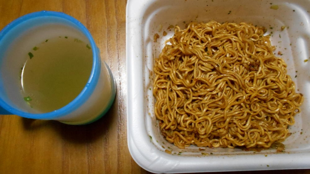 さっそく飲んでみたのですが、味はやや薄めで、少しピリッとしたスパイスと塩味が美味しかったです。なにげに焼きそばと交互食べても違和感がないどころか、むしろよく合う味だと思った。麺の茹で汁の油分がイイかんじで中華スープにマイルドさを足しているのでしょう。