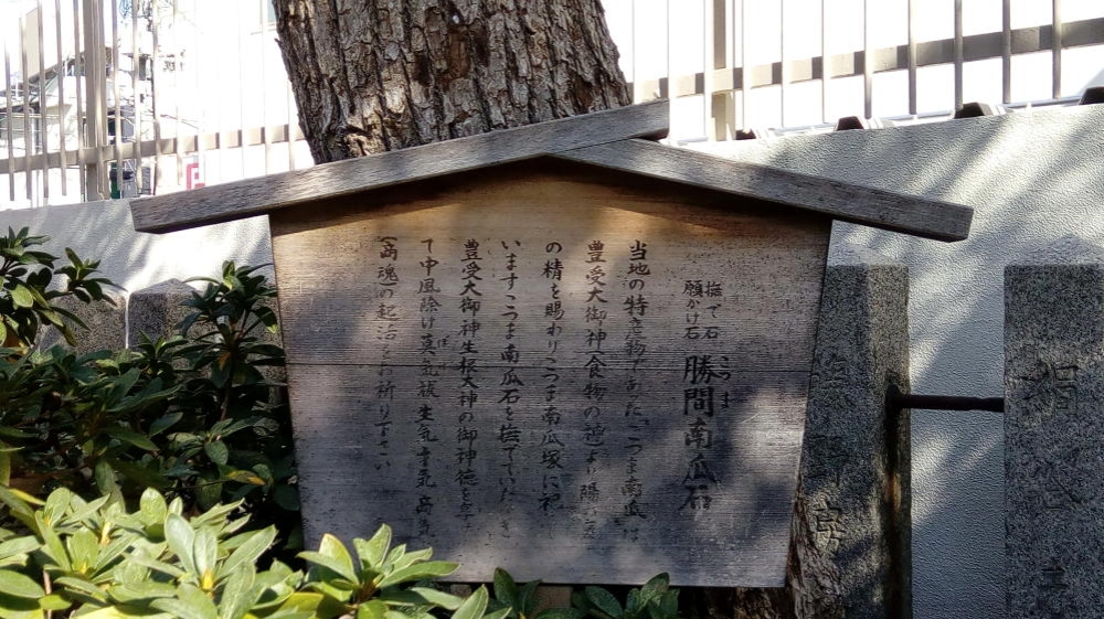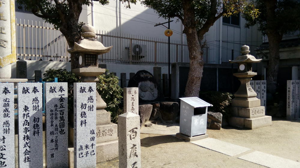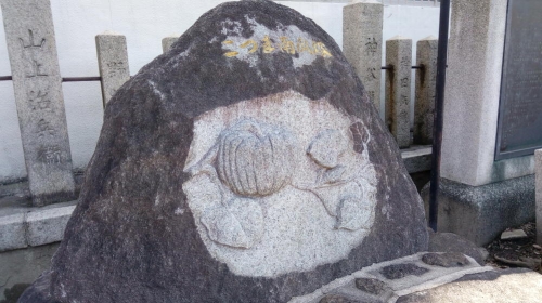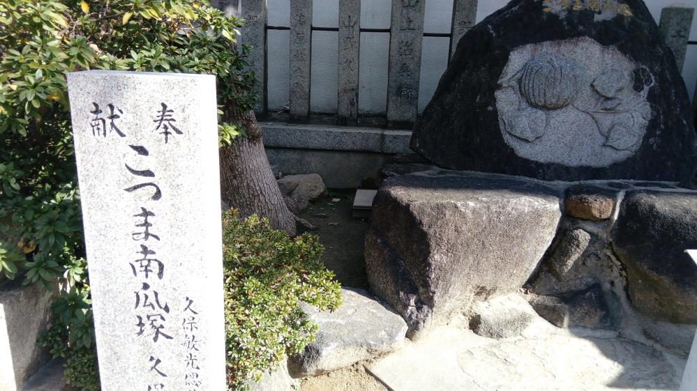 こつま南瓜塚(こつまなんきんづか)。昔、西成区玉出町は勝間村(こつまむら)と呼ばれていたらしく、こつま南瓜は勝間村の特産カボチャだったそうな。あるとき、村が飢饉になってしまい、大切に保存していたこつま南瓜を食べて飢えを凌いだため、こつま南瓜が奉られているってことらしい。
