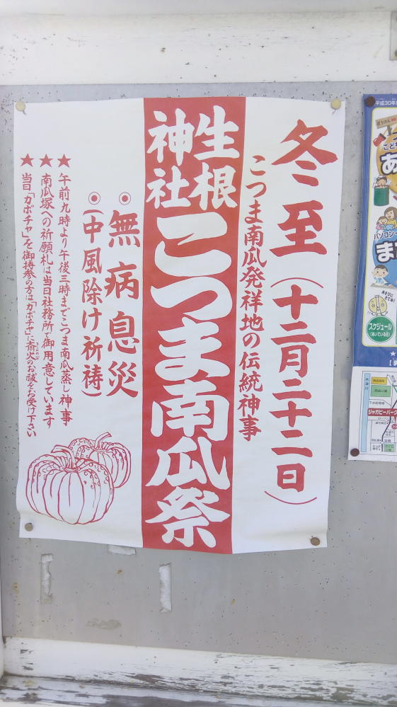 生根神社ちかくの公園の掲示板に『こつま南瓜祭』のポスターが貼られていました。冬至に生根神社で開催されるっぽいね。当日カボチャを持参した人は、カボチャに斎火(きよめび)お祓いを受けてくれって書いてる。