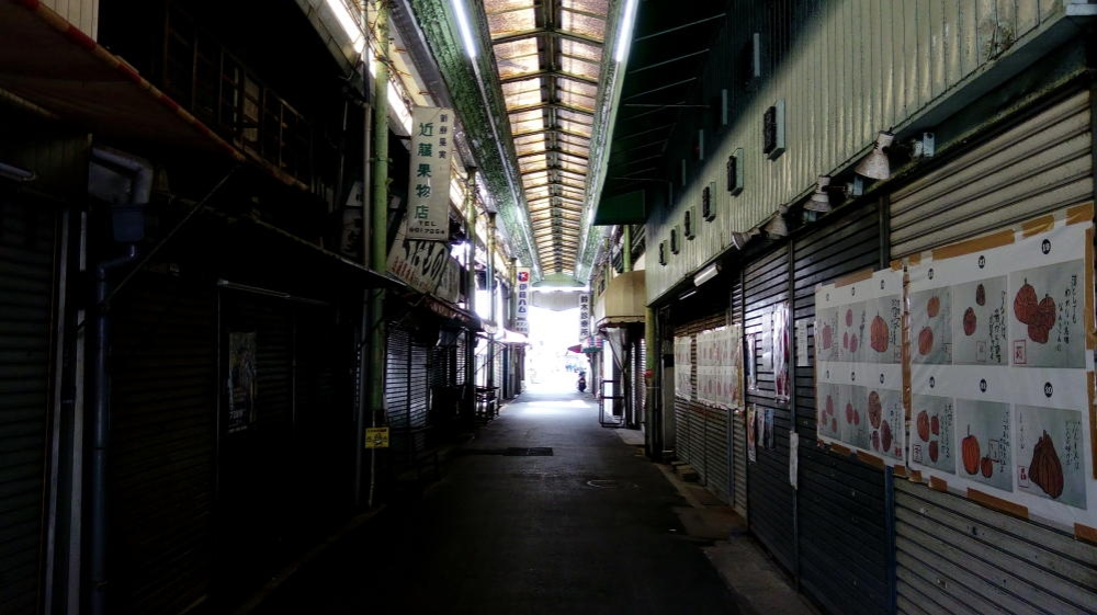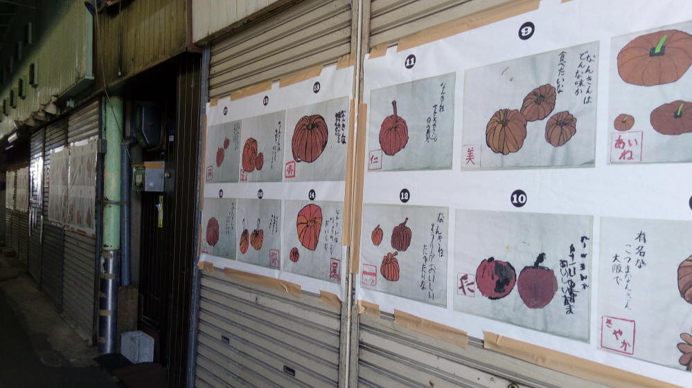 そんな玉出本通商店街の片隅に少し寂れた雰囲気の細い路地が北側にあるのですが、ここのシャッターには地元の学生が描いたっぽい『こつま南瓜の絵画』が展示されていました。