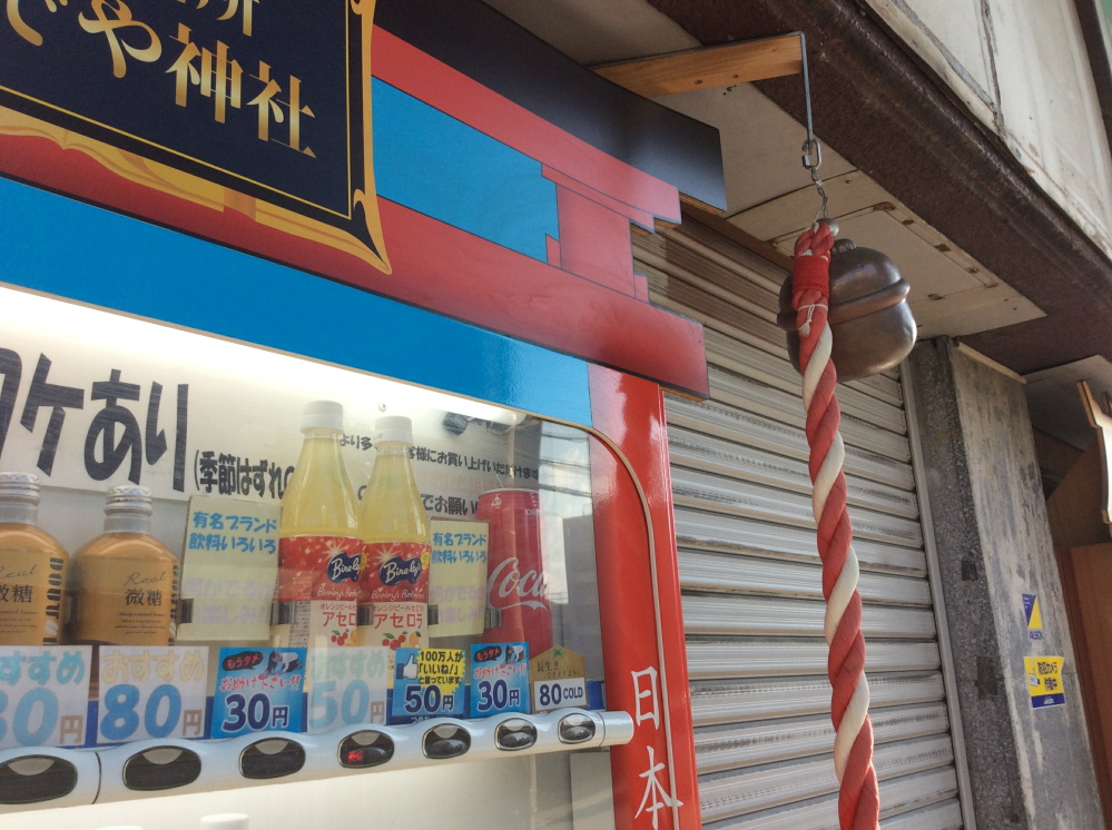 しっかりと鳥居があり、参拝用のデカい鈴もついている。ジュースの種類が豊富。なにげにどんなブランドのジュースがでるかわからないというおみくじ的要素を含んだ謎のボタン(30円)もある。