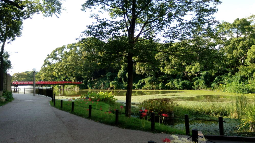 ここが天王寺公園の中にある河底池です。赤い橋(和気橋:わけばし)がトレードマークっす。