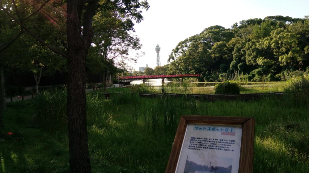 余談ですが、河底池の最東端には通天閣のフォトスポットがある。