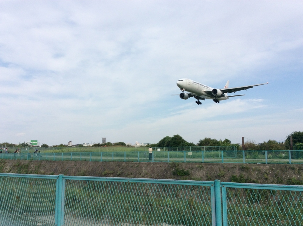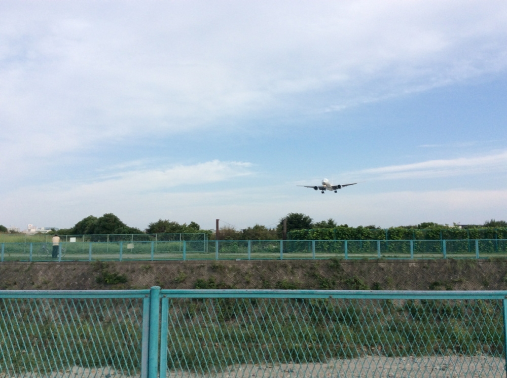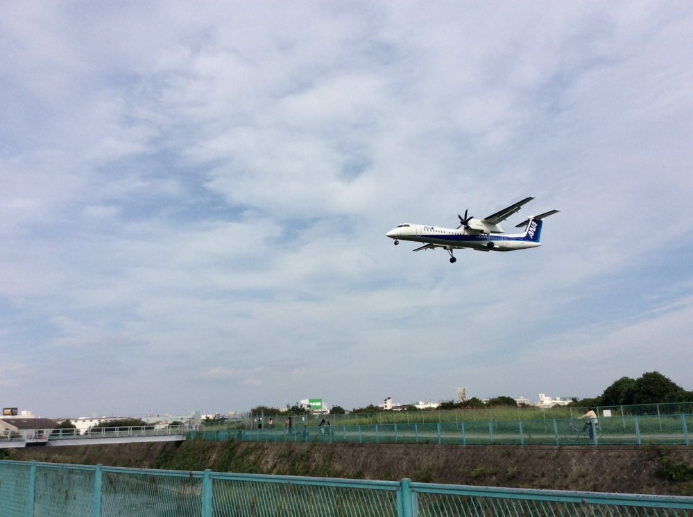 千里川の土手は伊丹空港の滑走路の最先端部分に位置するため、旅客機の離着陸が超至近距離でおこなわれるのだ。