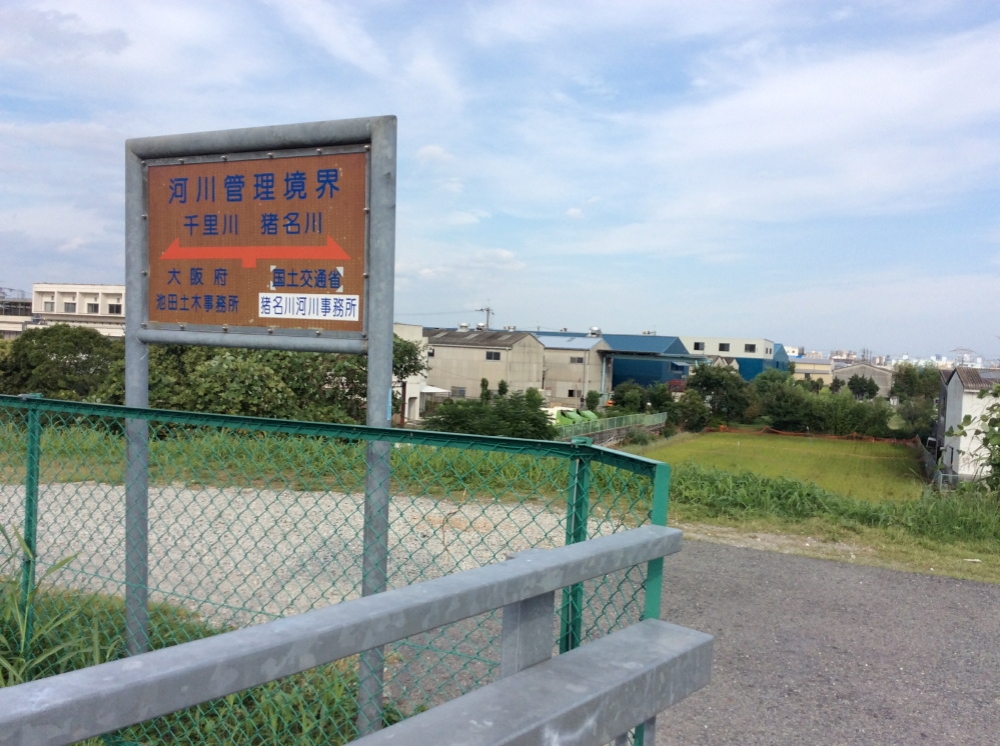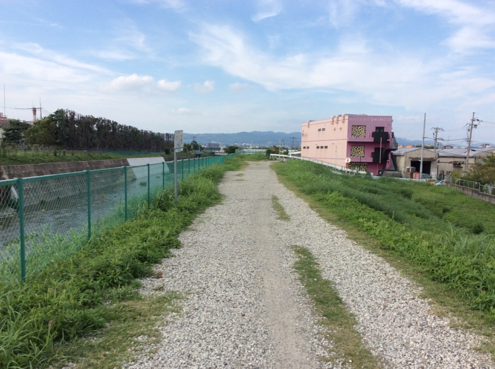 左へ行けば千里川。右へ行けば猪名川。もちろん左の砂利道を進む。
