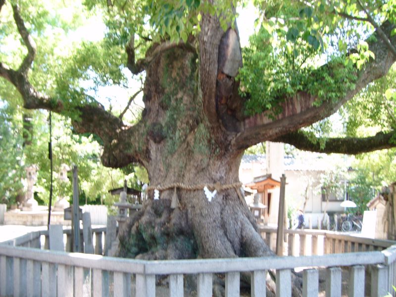 そのなかでもひときわ目を引くのが、境内の入り口付近に立つ大楠です。鳥居をくぐってすぐ左手にそびえるこの大木は、大阪府の天然記念物にも指定されており、堂々と枝を四方に広げています。まるで参拝者を迎える“守護者”のような存在感があり、思わず立ち止まって見上げてしまいました。