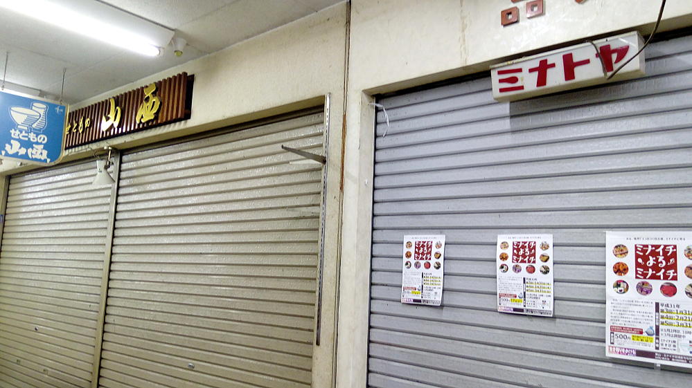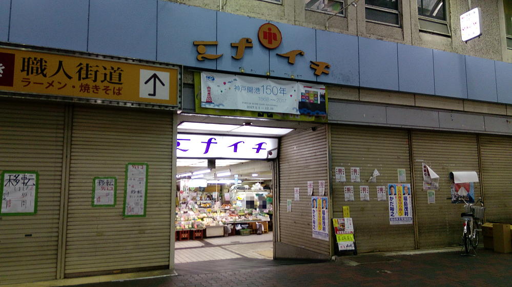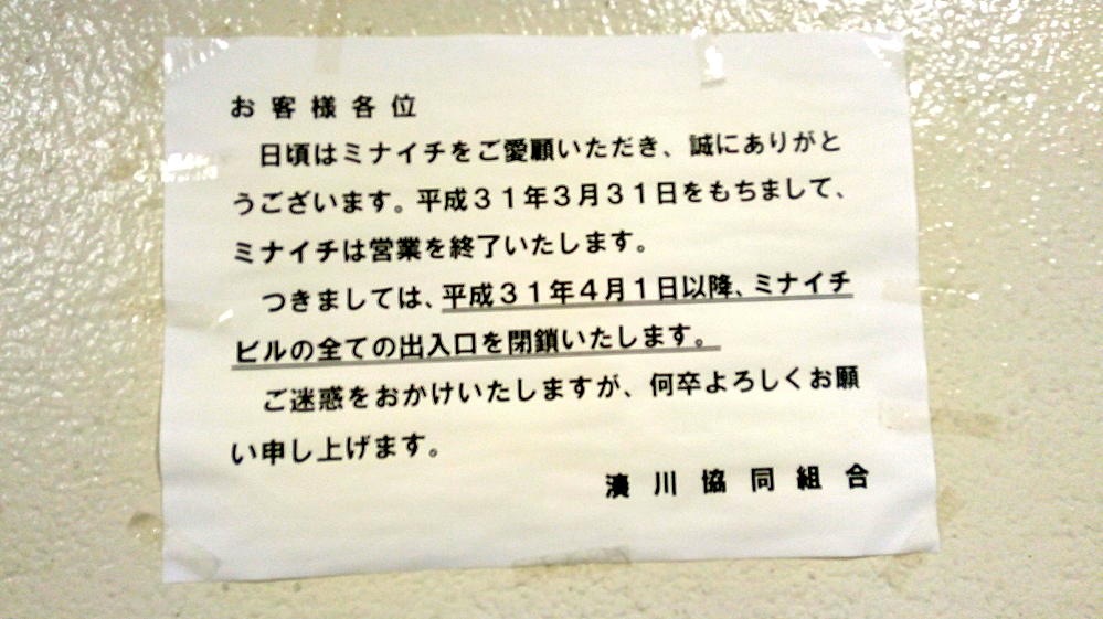 ミナイチビルは神戸市松本住宅っていう市営住宅と市場が一体化している巨大ビルなんですが、かなり老朽化しているということで建て替え閉鎖することとなった。まあ、建て替えるだけなので、いつかまた復活すると思うのですがね。