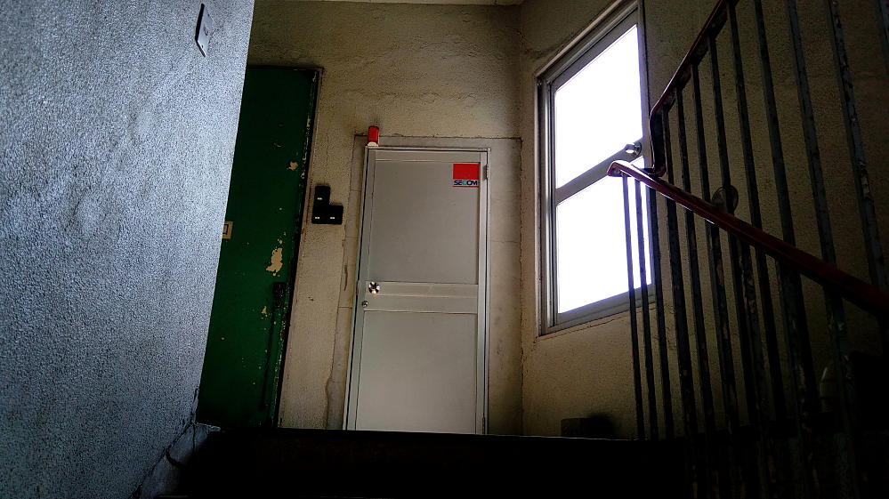 階段の手すりは錆びていて、全体的に薄汚れている光景は、歴戦の勇者感がある。