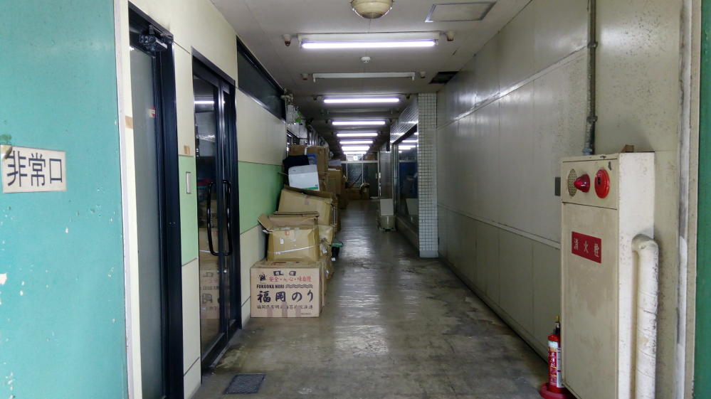 2階は基本的に、市場の商店や企業の事務所としての利用が多いため、お客さんは全然いないです。廊下には引っ越し準備なのか、段ボールがたくさん置かれてた。