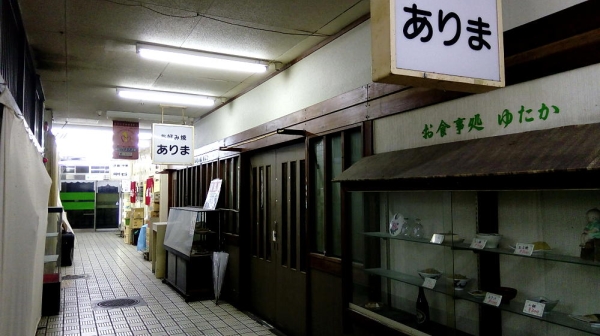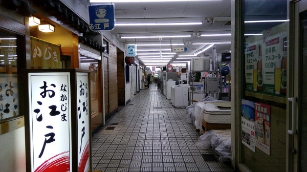 ビルに隣接する商店街の様子。写真右側の白い壁が、元ミナイチビルです。白い壁が道幅を狭くしているが、隣の商店街のほうは普通に営業しているので、この日も繁盛していたぞ。