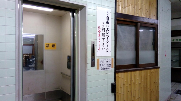 古いビルですが、エレベーターはある。ベビーカーは昔は乳母車(うばぐるま)って呼ばれていたみたいですが、エレベーター(昇降機)は昔からエレベーターって呼んでたんやな。