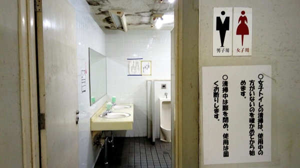 男子便所。湿気のせいなのか、天井の腐食がかなり進行していた。わりと老朽化は限界のところまできていたのかもしれないな。