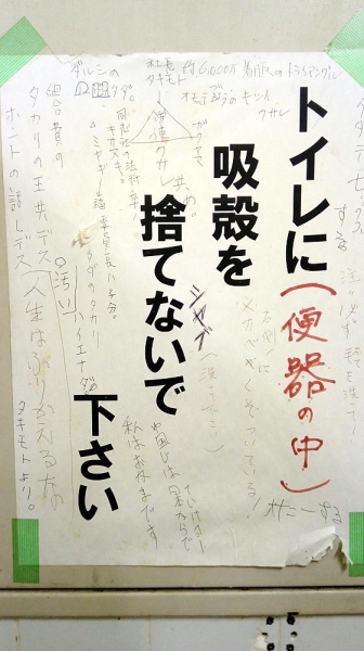 そして男子便所の貼り紙がえらいことになってた。こういうラキガキ、わりと好きです。「人生はふりかえるな」・・・タキモトって誰やねん。