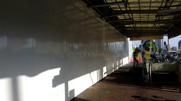 こちらはビルの西側の歩道です。写真右側がミナイチビル(神戸市松本住宅)ですが、もちろん白い壁なんてものは無い。