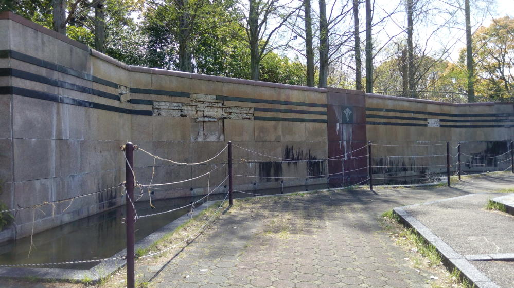 まず真っ先に目についたのは花壇のあるコンクリート広場。そしてその先には水の止まった噴水らしきものと、独特な雰囲気を醸し出す巨大壁。