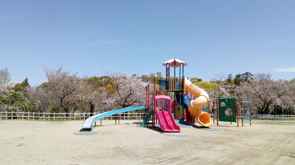 公園の山の頂上には遊具広場があり、小さな子にも優しい仕様。こっちのほうが桜がよく咲いていた。