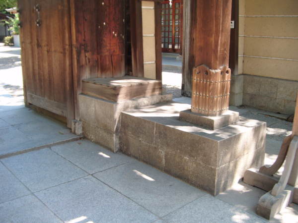 平野の杭全神社にある大門。ドーンと立派にそびえ立ってるんですが、よーく見ると・・・・・・なんか背伸びしてる!? そう、柱の下に石を積んで「かさ上げ」されてるんです。