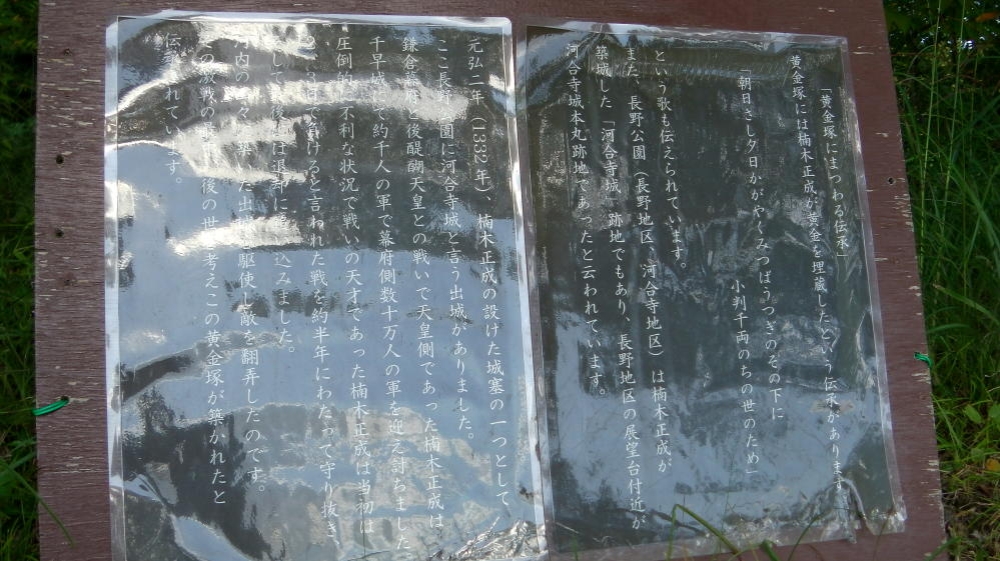 「黄金塚には楠木正成が黄金を埋蔵したという伝承があります」と書かれているぞ! 正成の兄貴まじパねぇっ!!