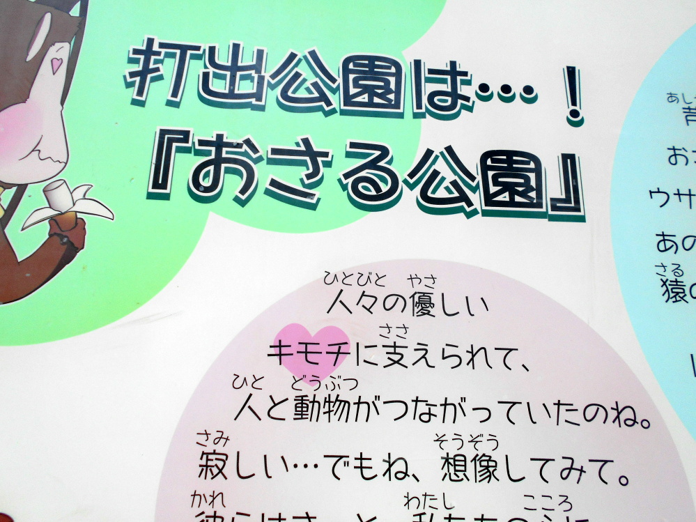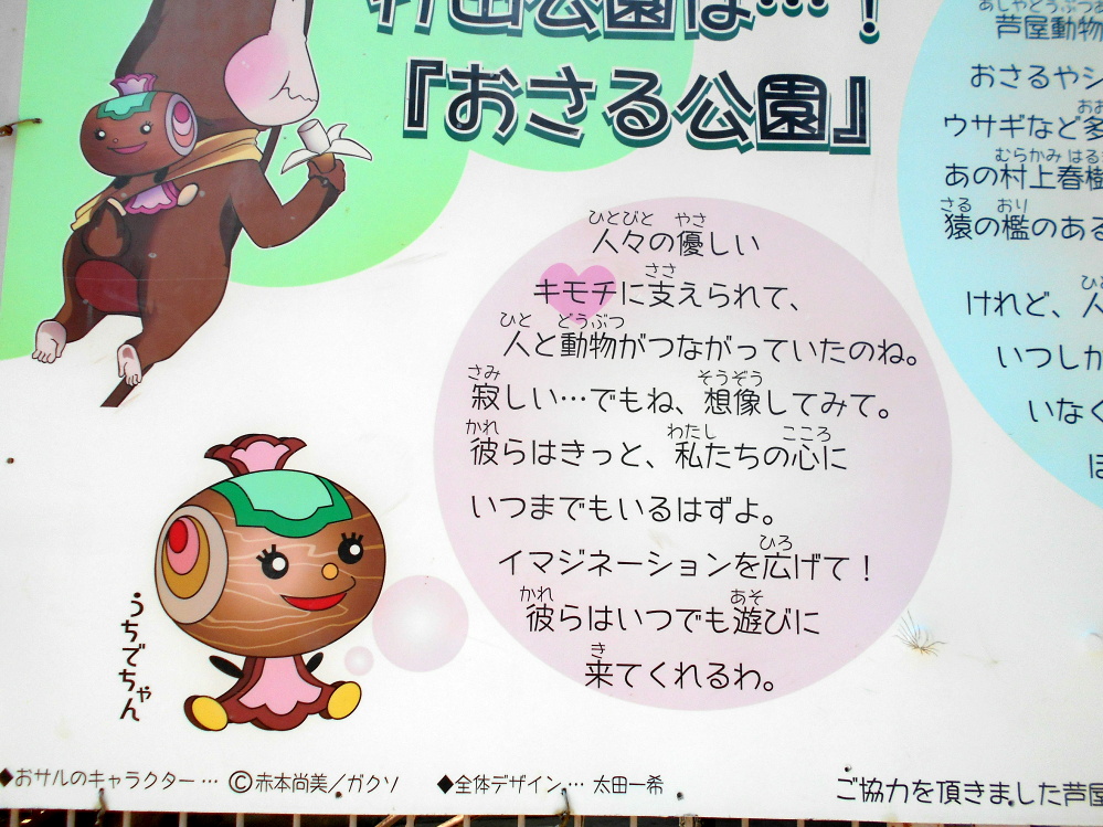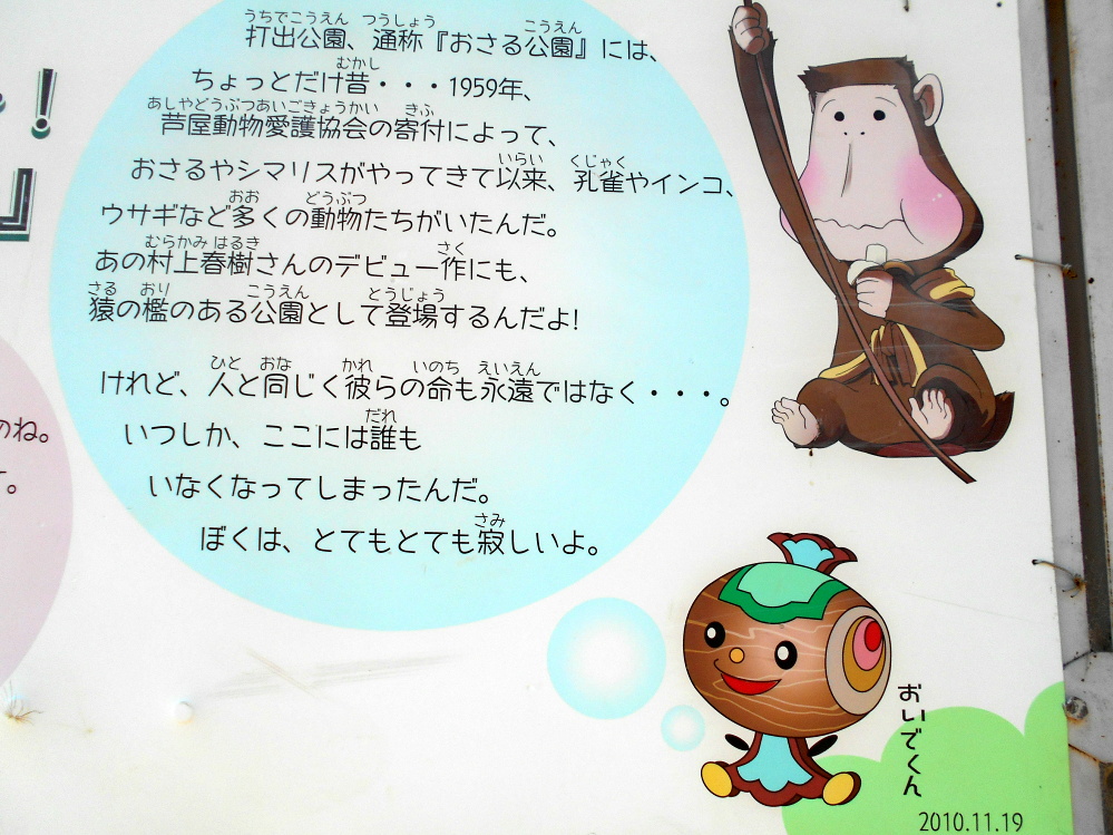 打出公園、通称『おさる公園』には、ちょっとだけ昔・・・1959年、芦屋動物愛護協会の寄付によって、おさるやシマリスがやってきて以来、孔雀やインコ、ウサギなど多くの動物たちがいたんだ。 あの村上春樹さんのデビュー作にも、猿の檻のある公園として登場するんだよ! けれど、ひとと同じく彼らの命も永遠ではなく・・・。いつしか、ここには誰もいなくなってしまったんだ。ぼくは、とてもとても寂しいよ。