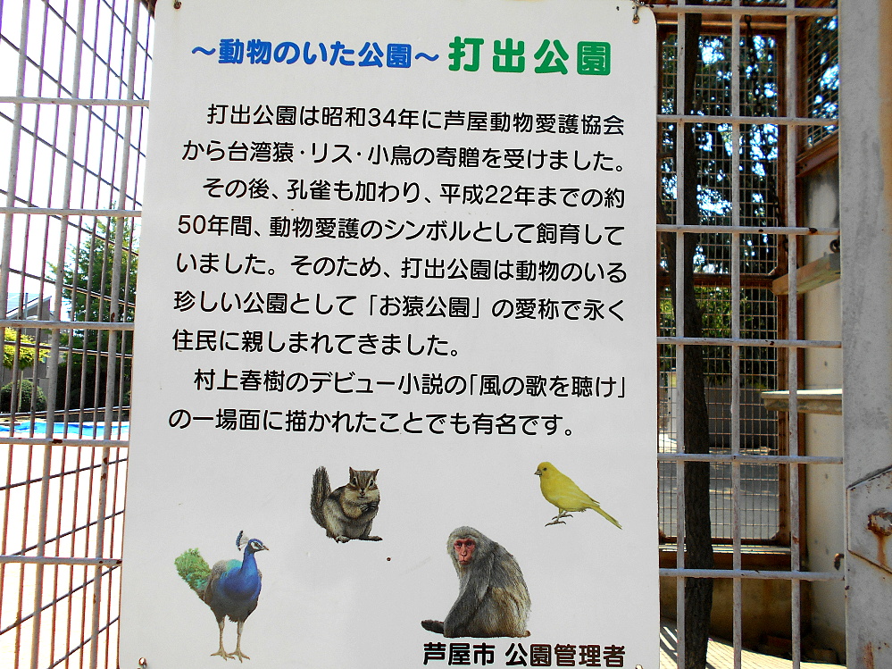 打出公園は昭和34年に芦屋動物愛護協会から台湾猿・リス・小鳥の寄贈を受けました。 その後、孔雀も加わり、平成22年までの約50年間、動物愛護のシンボルとして飼育していました。そのため、打出公園は動物のいる珍しい公園として「お猿公園」の愛称で永く住民に親しまれてきました。 村上春樹のデビュー小説の「風の歌を聴け」の一場面に描かれたことでも有名です。 芦屋市公園管理者