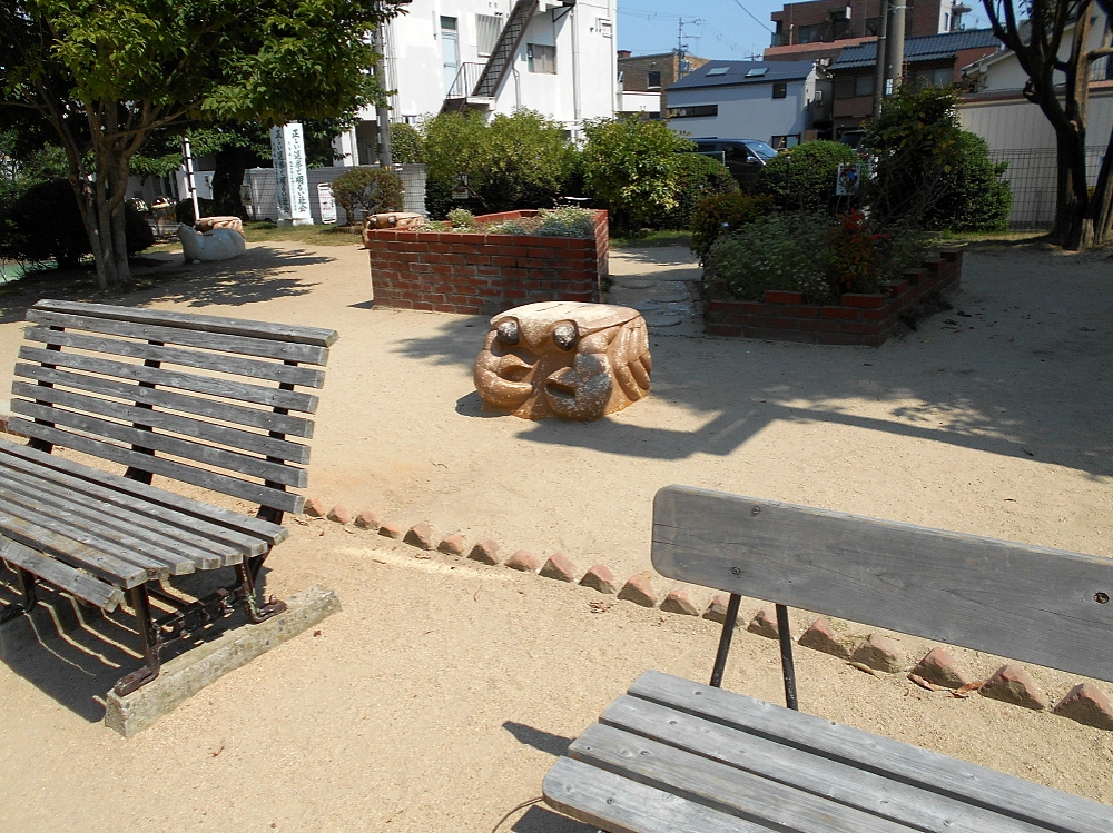 まずベンチがあります。子供たちを遊ばせている間、親たちはここで世間話に花を咲かせています。 そしてベンチの後ろにはなぜかカニの石像?がある。